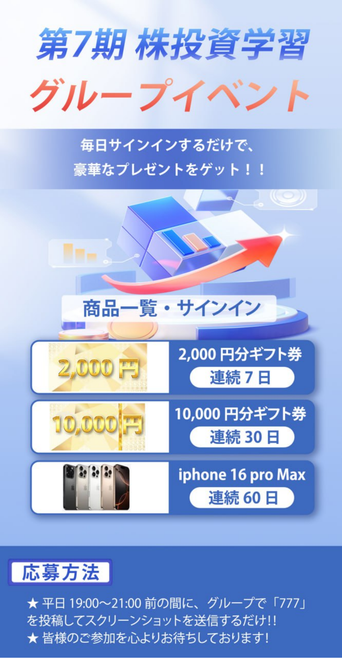 このたび、第7期株投資学習グループのスタートを記念し、参加者全員を対象とした豪華プレゼントキャンペーンを実施いたします。期間中は、毎日のサインインで、さまざまな特典をご用意しております。投資の知識を深めながら豪華賞品を手に入れるチャンスです。